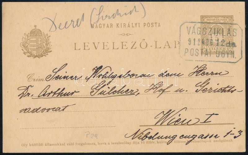 https://www.darabanth.com/en/504-Online-auction/504.0/Hungarian-philately-and-postal-history/Issues-between-1900-1919~500033/1912-Dijjegyes-levelezolap-VAGSZIKLAS-postaugynoksegi-belyegzessel-Becsbe~II3425211