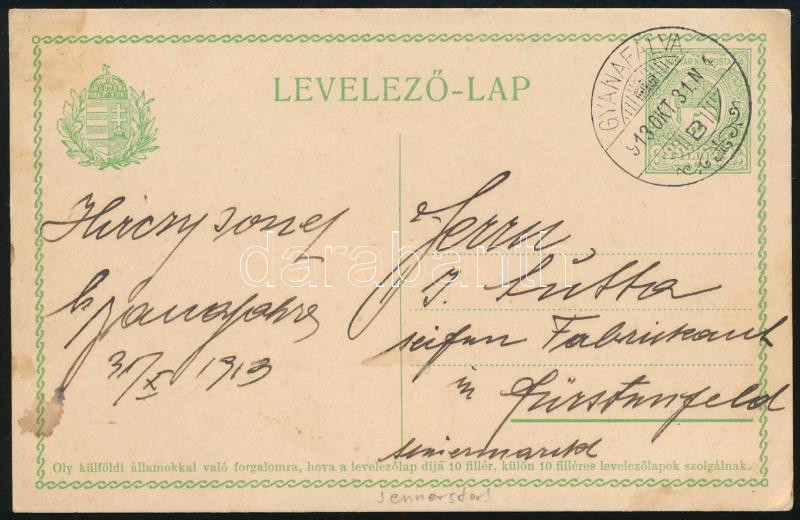 https://www.darabanth.com/en/504-Online-auction/504.0/Hungarian-philately-and-postal-history/Issues-between-1900-1919~500033/1913-5f-dijjegyes-levelezolap-GYANAFALVA-Furstenfeld~II3422297