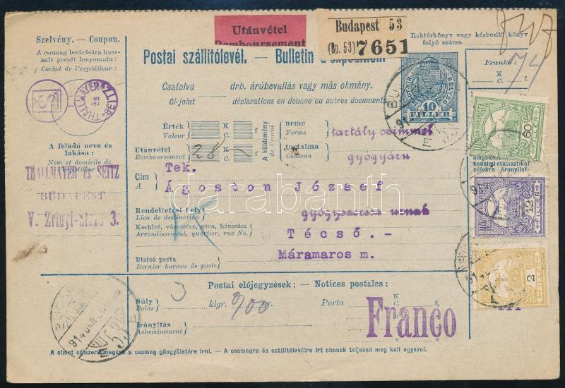 1914 Utánvétes teljes szállítólevél 3 színű Turul bérmentesítéssel, há...
