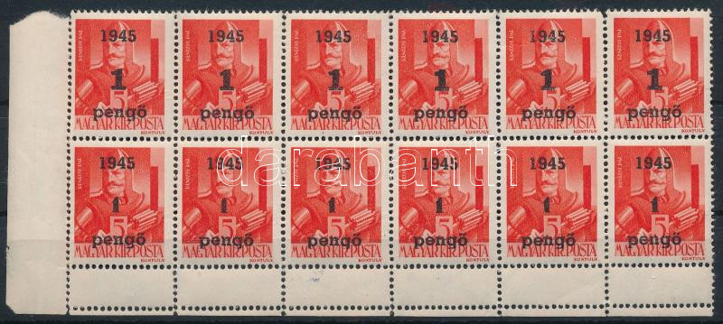 Nagyvárad I. 1945 Hadvezérek 1P/5f ívsarki 12-es tömbben, a felső 6 bélyeg I. típus, az alsó 6 bélyeg pedig II. típus, Bodor vizsgálójellel (18.000)