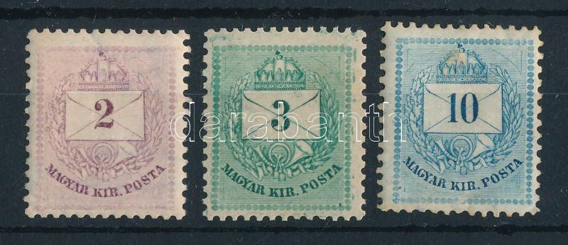 1881 3 db bélyeg, a 3kr festékfoltokkal (2kr saroktörés / folded corner, 10kr rozsda, alul sérülés / stain, damaged below)