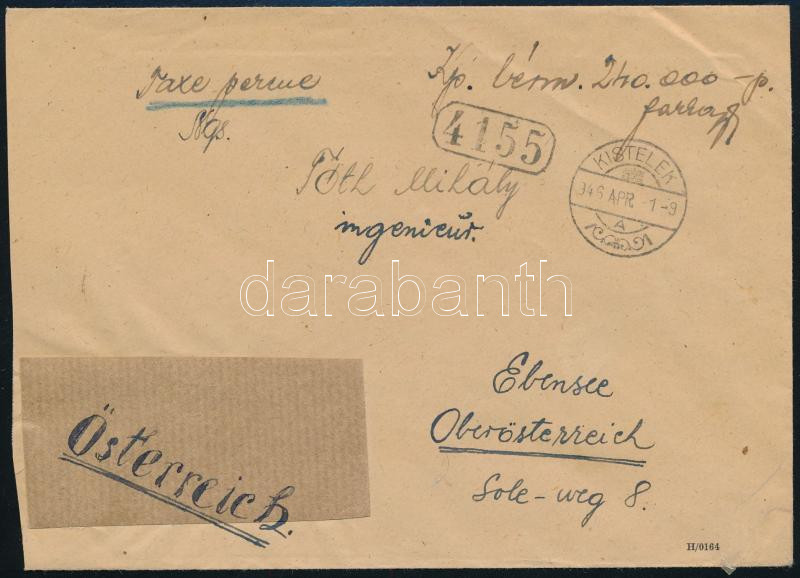 Description: 1946 (11. díjszabás) Levél 320.000P bérmentesítés helyett a 10-es díjszabás tarifájával (240.000P) feladva Kistelekről Ausztriába. Egy nap türelmi idővel vették fel!