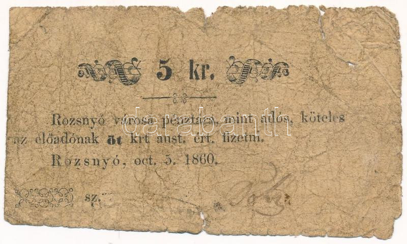 https://www.darabanth.com/en/504-Online-auction/504.0/Numismatics/Emergency-Coins-and-Notes~4500053/1860-Rozsnyo-5kr-3Cem3ERozsnyo-varos-penztara-mint-ados3Cem3E-TVG-G3Cbr-3E-Adamo-ROZ-312~II3162113