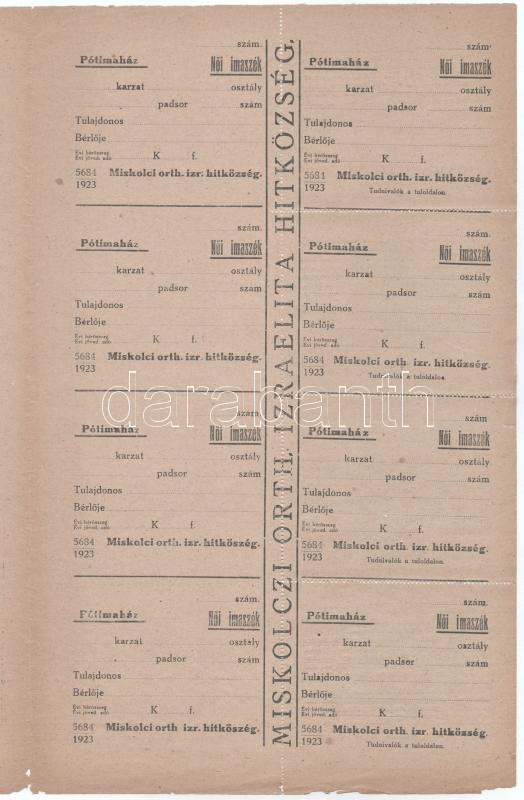 1923. Miskolc "Miskolci orth. izr. hitközség / Pótimaház" női imaszékre szóló bárca ellenőrzőszelvénnyel, kitöltetlen, perforált ívben, első lapon félrecsúszott nyomtatással, ortodox izraelita hitközség (összesen 8 pár)