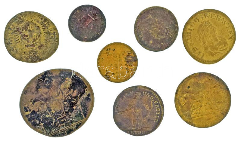 Mixed 8xdiff counter token / jeton lot, including German Empire 1888. "Friedrich Deutscher Kaiser König von Preussen / Lerne Leiden Ohne Zu Klagen" two-sided brass token, with framemark (17mm) C:VF,F, patina