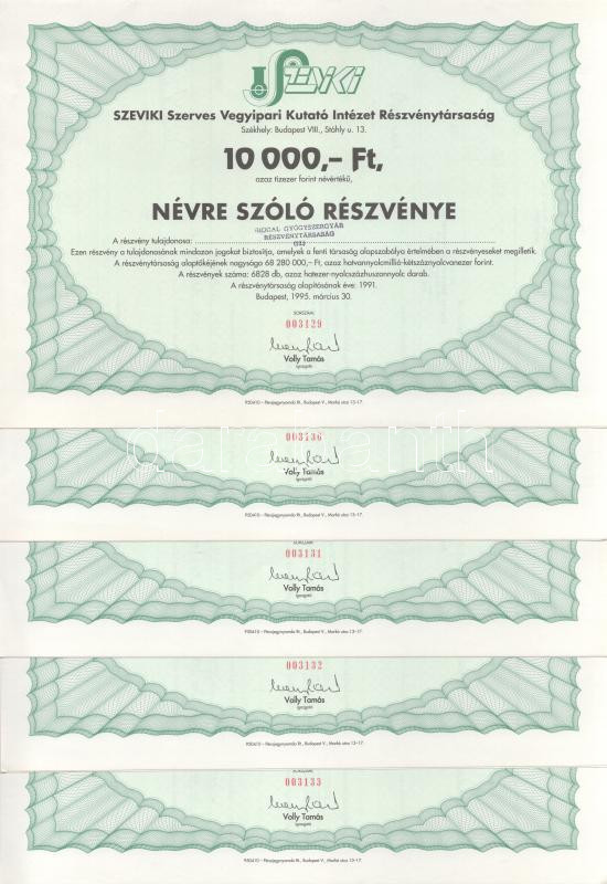 Description: 1995. Budapest "SZEVIKI Szerves Vegyipari Kutató Intézet Részvénytársaság " névre szóló részvénye 10.000Ft-ról (5x) sorszámkövetők "003129-003133, szelvényekkel, bélyegzéssel T:AU