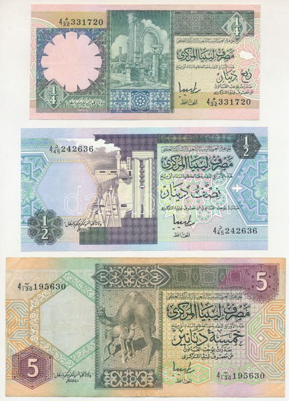 Libya 1991. 1/4 Dinar + 1/2 Dinar + 5 Dinars C:VF,F, fine paper