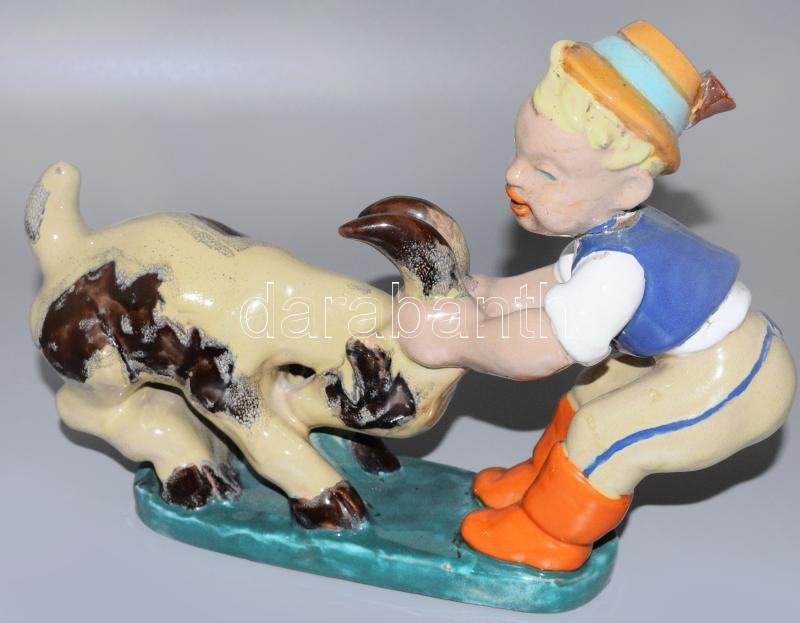 Komlós Kerámia fiú kecskével. Feje ragasztott, jelzett, 28x20 cm