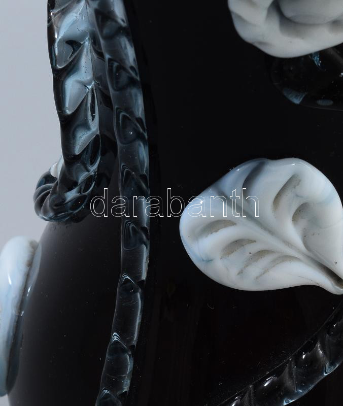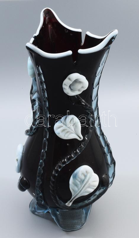 Régi kézműves bíborüveg váza, fehér opálüveg szélezéssel és rátétekkel, hutaüveg, hibátlan, m: 32 cm