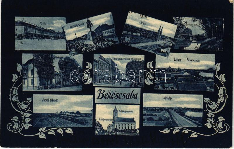 1912 Békéscsaba, Fő tér, Kossuth szobor, selyemgyár, vasútállomás, Vasút utca, Városi színház, Evangélikus nagytemplom, Rudolf gimnázium. Art Nouveau, floral
