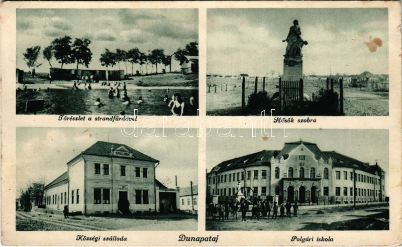 1934 Dunapataj, Tó részlet a strandfürdővel, fürdőzők, Hősök szobra, emlékmű, Községi szálloda, Polgári iskola. Vass Istvánné kiadása (fl)