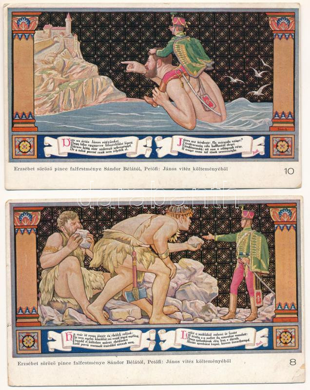 Description: Budapest V. - 2 db RÉGI képeslap: Erzsébet Királyné Szálló étterem és söröző pince, Sándor Béla falfestménye Petőfi Sándor János vitézéből. Egyetem utca 5.