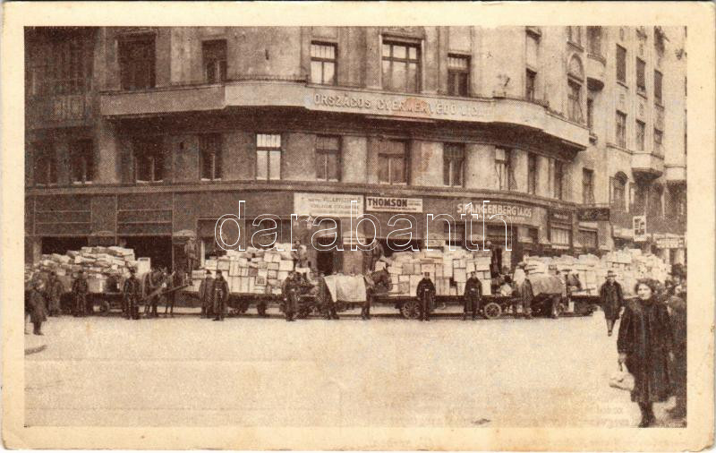 Description: Budapest VII. Országos Gyermekvédő Liga központi irodája, Külföldi szeretetadományokkal telt, lerakodásra váró társzekerek, Spangenberg Lajos kalapos üzlete (EB)