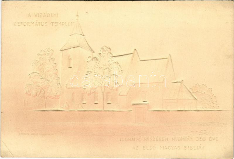 Description: Vizsoly, Református templom. Leghátsó részében nyomták 350 éve az első magyar bibliát. Dr. Sipos István és Koczor Dezső kiadása. Emb. Szeiler dombornyomása (EK)