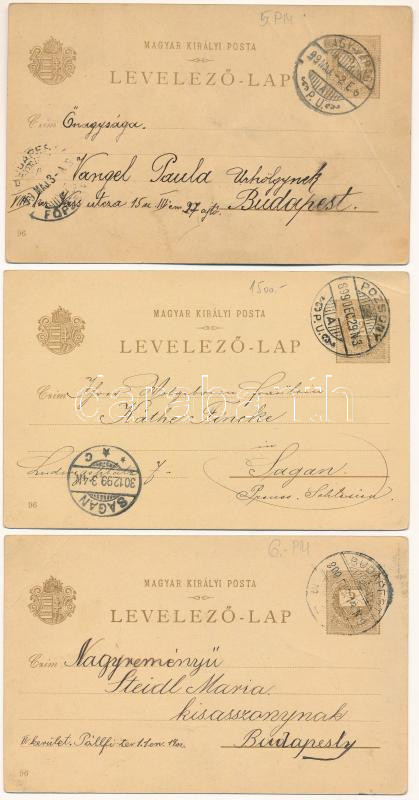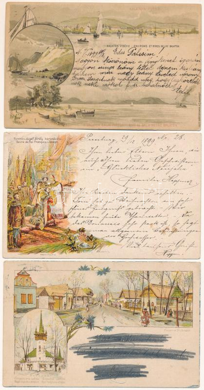 Description: 3 db RÉGI (1900 előtti) díjjegyes Ezredéves Országos Kiállítás művész képeslap. Balaton vidéke, Ferenc József király koronázása, Magyar utca és templom / 3 pre-1900 Hungarian Millennium Exposition art postcards with brown 2 Kr. Ga.