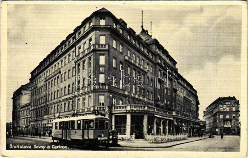 Pozsony, Pressburg, Bratislava; Savoy a Carlton, café / Savoy és Carlton szálloda, kávézó, villamos, Bocek & Valentik Foto / hotels, café, shops, tram (EK)