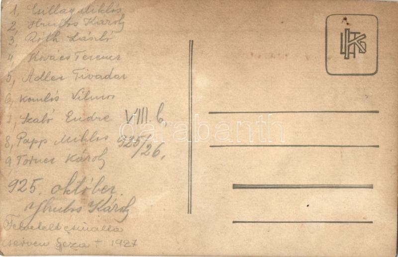 1925 Magyar amatőr diák labdarúgó csapat, hátoldalon a csapattagok nev... https://www.darabanth.com/en/504-Online-auction/504.0/Postcards/Sport~2000076/1925-Magyar-amator-diak-labdarugo-csapat-hatoldalon-a-csapattagok-nevei-Hungarian-amateur-st~II1658033