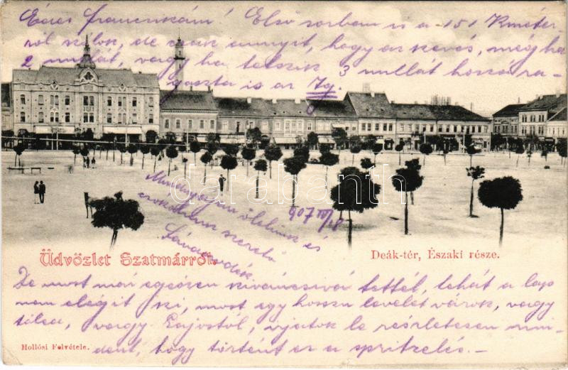 1907 Szatmárnémeti, Satu Mare; Deák tér északi része, üzletek. L. D. F. 141. / square, shops (kis szakadás / small tear)