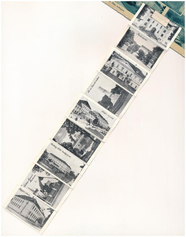 1941 Sepsiszentgyörgy, Sfantu Gheorghe; Székely kapu, Székely Mikó kollégium, utca, 48-as honvéd szobor, park. leporellolap 10 kis képpel. Lapikás Béla kiadása / boarding school, street, military heroes statue, park, gate. leporellocard with 10 mini pictures + "1941 Székelyföldi Kiállítás és Vásár Sepsiszentgyörgy" So. Stpl (ragasztónyom / glue mark)