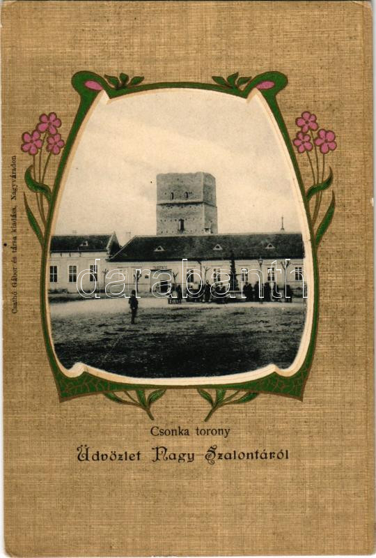 Nagyszalonta, Salonta; Csonka torony, Takarékpénztár. Csathó Gábor és Társa kiadása, szecessziós-virágos litho keret / tower, savings bank. Art Nouveau, floral, litho frame (EK)