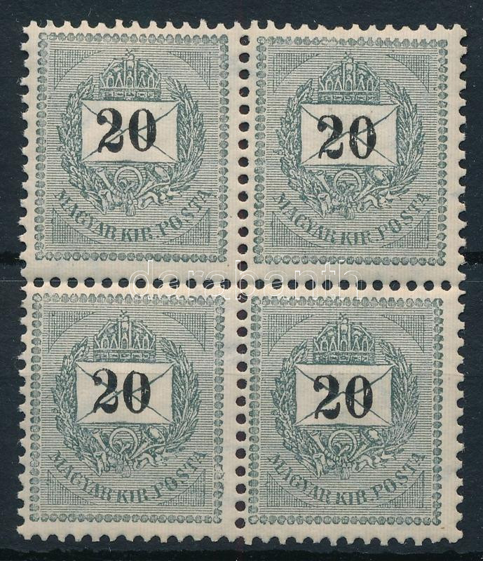1889 20kr postatiszta négyestömb, 12: 11 3/4 fogazás (24.000) (rozsda ...