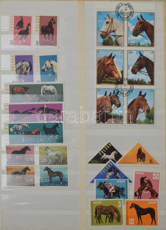 Lovak, lovasok, lovaskocsik, kutyák, macskák motívum gyűjtemény, több mint 600 bélyeg az egész világból nagy berakóban