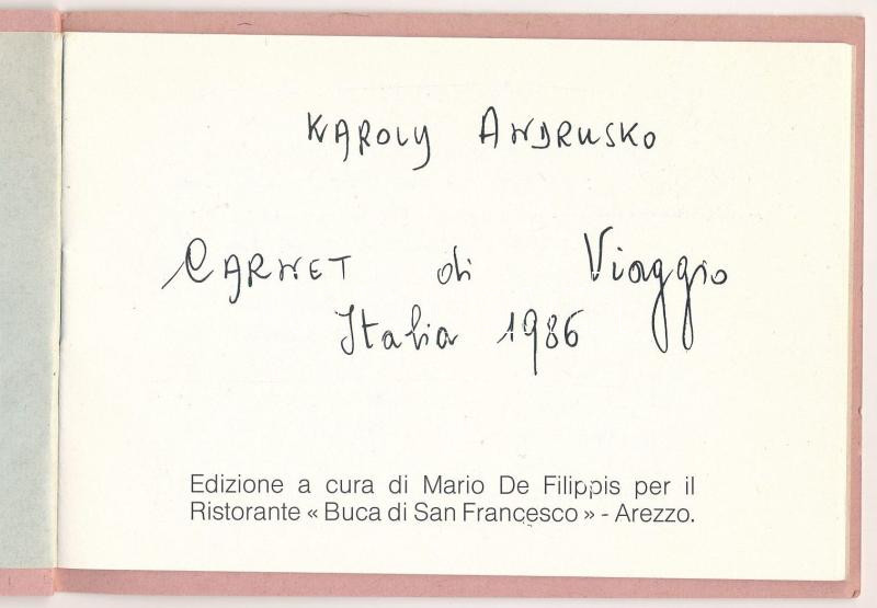 Description: Andruskó Károly (1915-2008) mappa/füzet: Appunti di un viaggio in It6alia, parte prima - Venezia, Firenze, 1986 (többségében ex librisek reprodukcióival. 8,5x11 cm.