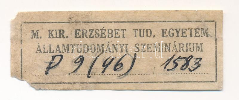 M. kir. Erzsébet Tud. Egyetem Államtudományi Szeminárium (könyvjegy). Nyomat, papír, sérült, 2x5 cm.