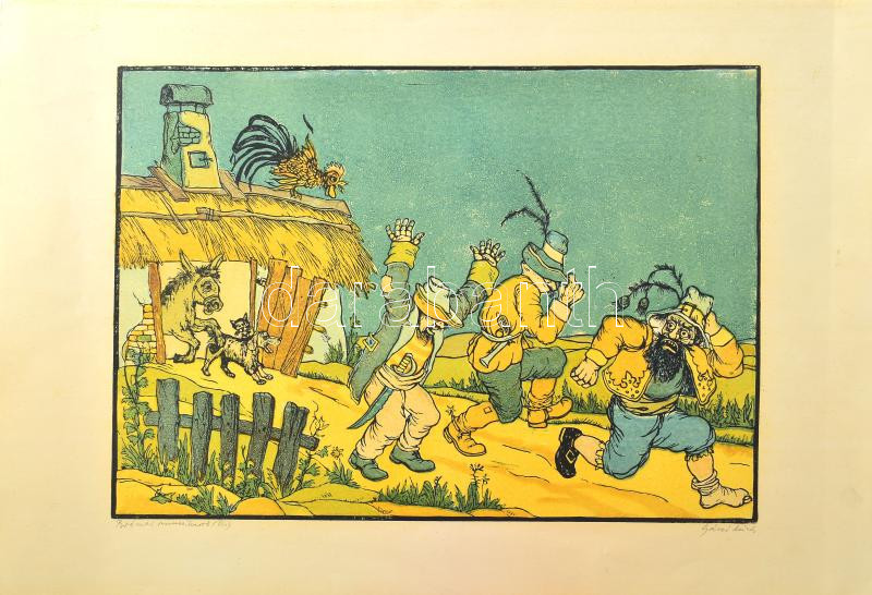 Gácsi Mihály (1926-1987): Brémai muzsikusok III. Színes linómetszet, papír. Jelzett . 32×45 cm