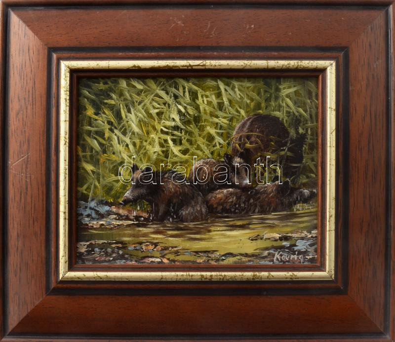 Kovrig Miklós (1951-): Dagonyázás (vaddisznó süldők). Olaj, farost. Jelzett. Hátoldalán autográf felirattal. 12x15 cm. Dekoratív fakereteben.