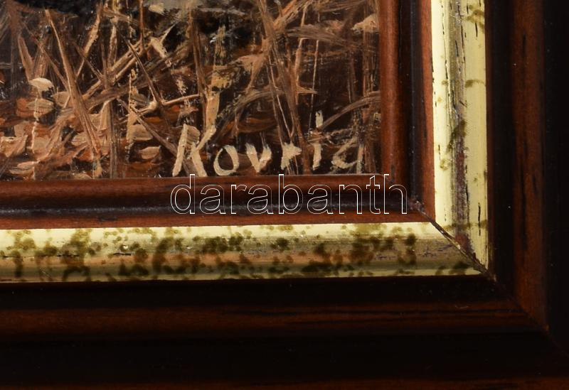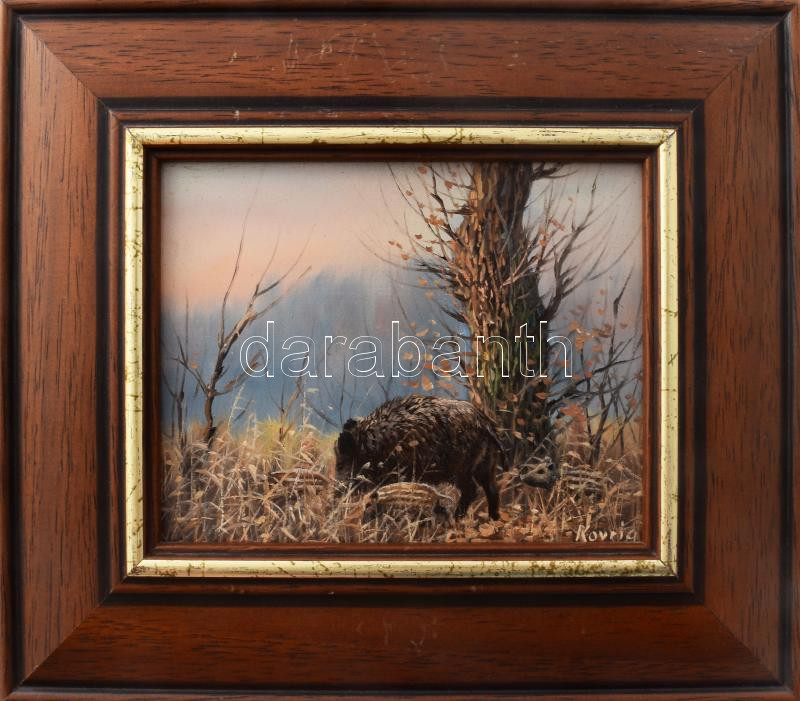 Kovrig Miklós (1951-): Koratavasz (vaddisznó). Olaj, farost. Jelzett. Hátoldalán autográf felirattal. 12x15 cm. Dekoratív fakereteben.