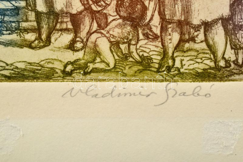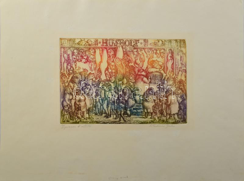 Description: Szabó Vladimír (1905-1991): Husiparos rémálma. Színes rézkarc, papír, jelzett. Művészpéldány Éreuve d'artiste jelzéssel. Hátoldalán MNG kiviteli bélyegzővel. Lap szélén apró felületi sérülésekkel (paszpartuzás nyomaival). 19,5×29 cm /