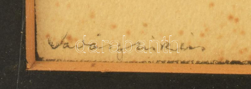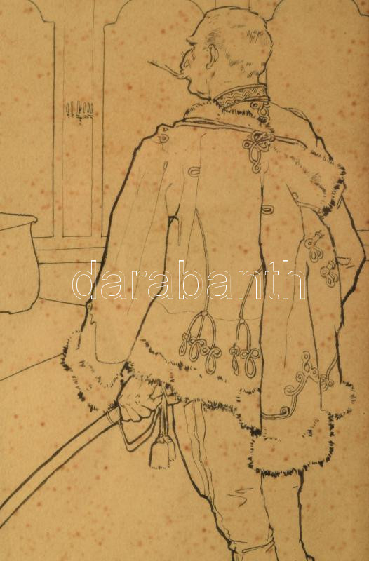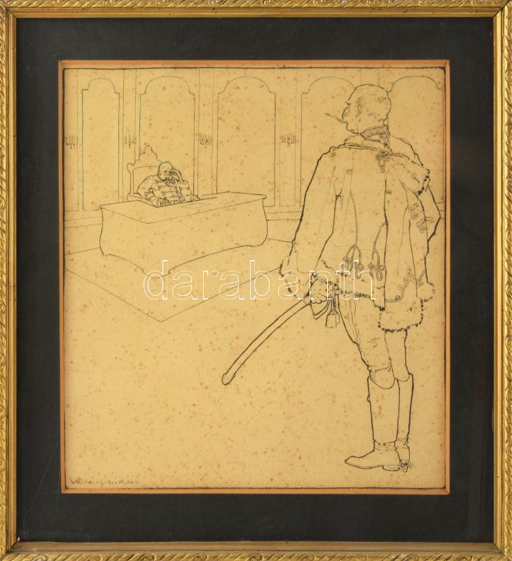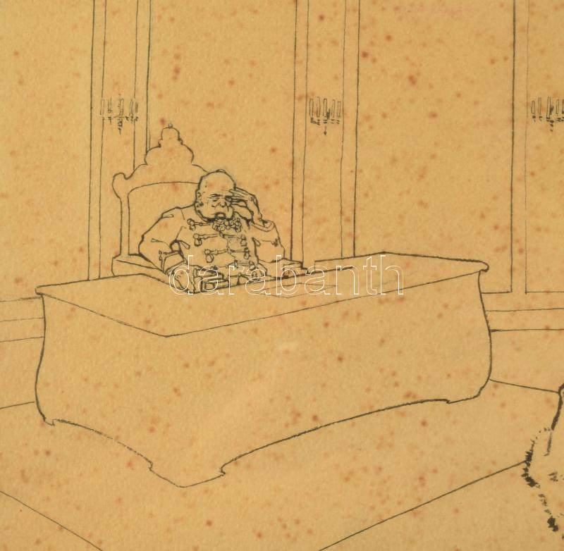 Vadász Miklós (1884-1927 v. 1928): Katona Ferenc József császár és király előtt. Tus, papír. Jelzett. Kissé foltos. Üvegezett fakeretben. 26×23,5 cm