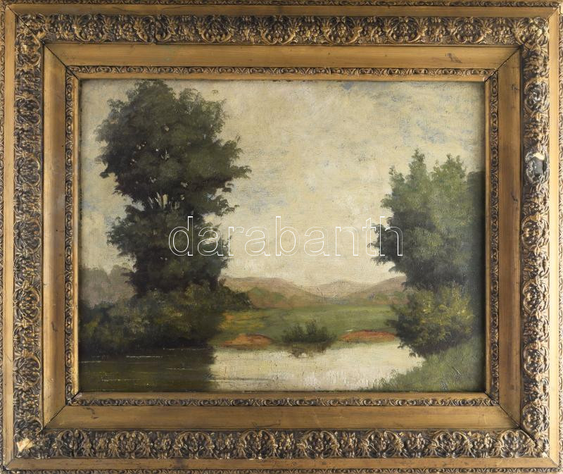 Wiegand, Gustave Adolph (1870-1957): Vízparti táj. Olaj, karton, jelezve balra lent. Hátoldalán 1920-40 körüli töredékes magyar raglappal. Dekoratív, sérült fakeretben. 40×51,5 cm.