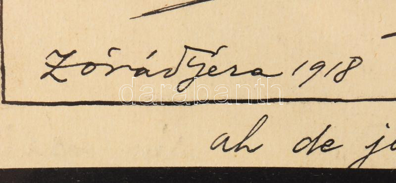 Description: Zórád Géza (1882-1961): "Ah de jó tükör lett ebből a fényes kabátból" (karikatúra), 1918. Akvarell, tus, papír, jelzett, üvegezett fakeretben, 15×20 cm