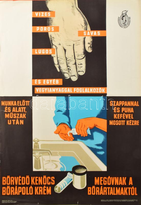 1964 Vizes, poros, savas, lugos és egyéb vegyianyagokkal foglalkozók (...). Egészségügyi felvilágosító plakát, papír, jelzés nélkül, Athenaeum Nyomda, hajtásnyommal, lapszéli kisebb szakadásokkal, 69x47,5 cm