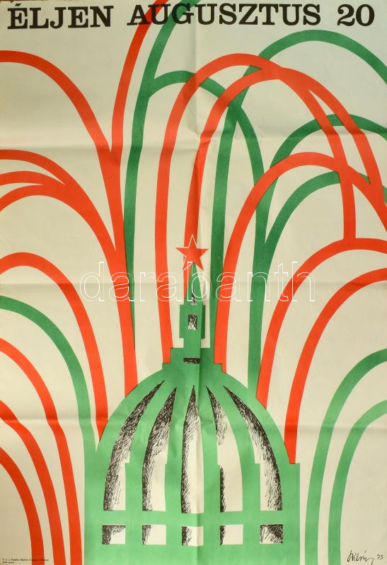 1973 Szilvásy Nándor (1927-2011): Éljen augusztus 20, nagyméretű plakát, papír, jelzett a plakátos, Hazafias Népfront Országos Tanácsa kiadása, Bp., Offset-ny., hajtva, lapszéli sérülésekkel, 114x81 cm