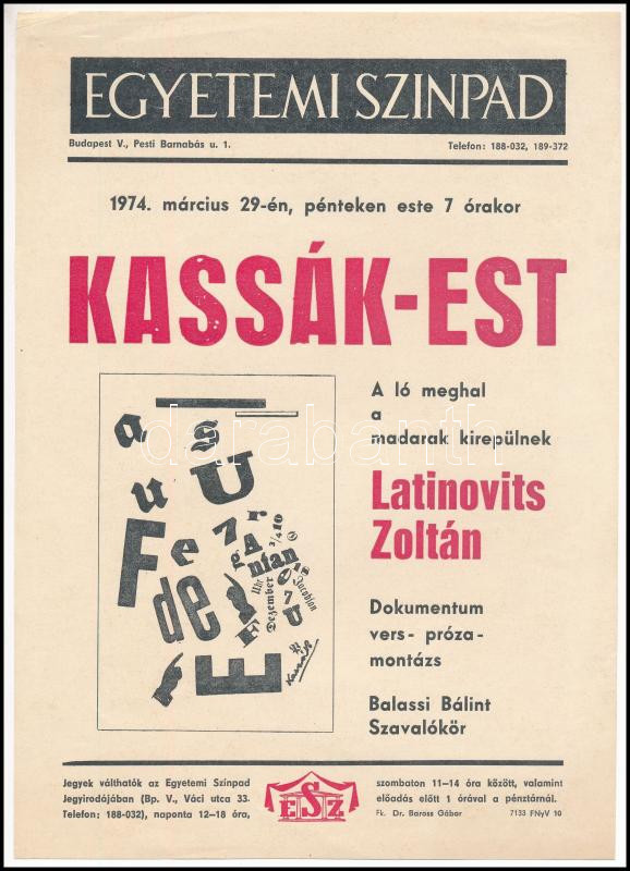 1974 Kassák-est, Latinovits Zoltán, Egyetemi Színpad. Plakát, papír. A...