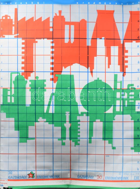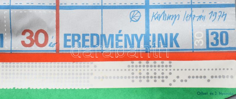 Kulinyi István (1945- ): 30 év, gazdasági eredményeink, 1974. Szocmodern-absztrakt-neoavantgárd propaganda plakát piros-fehér-zöld trikolórral, papír, jelzett a plakáton, Offset és J. Nyomda, kiadja: kiadja MSZMP KB Agitprop Osztálya, feltekerve, apró lapszéli gyűrődésekkel, 96×67 cm