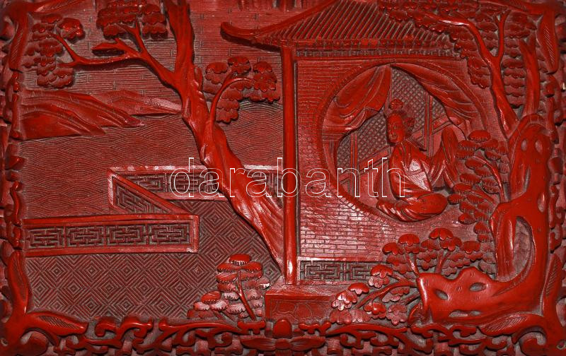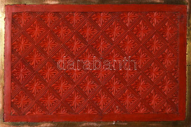 cca 1930, Faragott lakk díszítéses kínai réz ékszeres doboz, jó állapotban, 10x15,5 cm