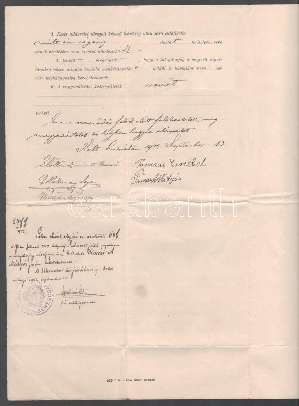 1902 Békéscsaba, adásvételi szerződés Gallai Istvánné Paróczai Erzsébe...