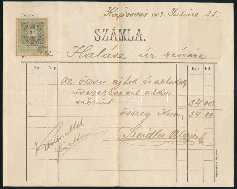 1903 Kaposvár, Szeidler Alajos üveges által kiállított számla, 2f okmá...