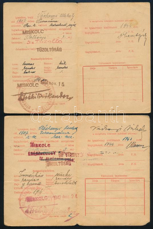 1942-1944 Miskolc, 2 db igazolvány különleges légvédelmi szolgálatra k...