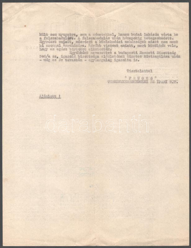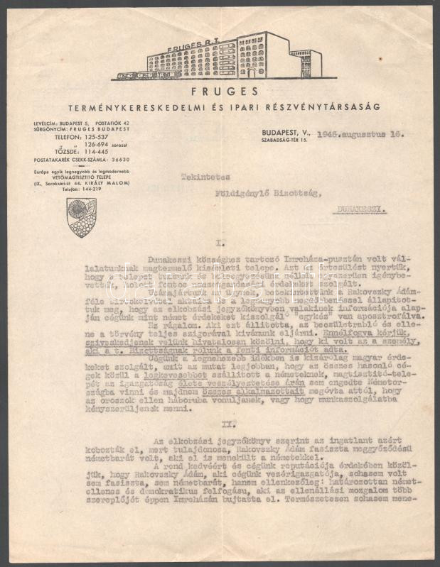 Description: 1945 Dunakeszi helytörténeti irat, melyben a községhez tartozó Imreháza-pusztán működött Fruges cég magtermelő kísérleti telepét német érdekek kiszolgálása miatt elkobozták és e levél a cég részéről felsorolta, miért hamis ez az állítás és jogtalan az elkobzás, két gépelt oldal, jó állapotban