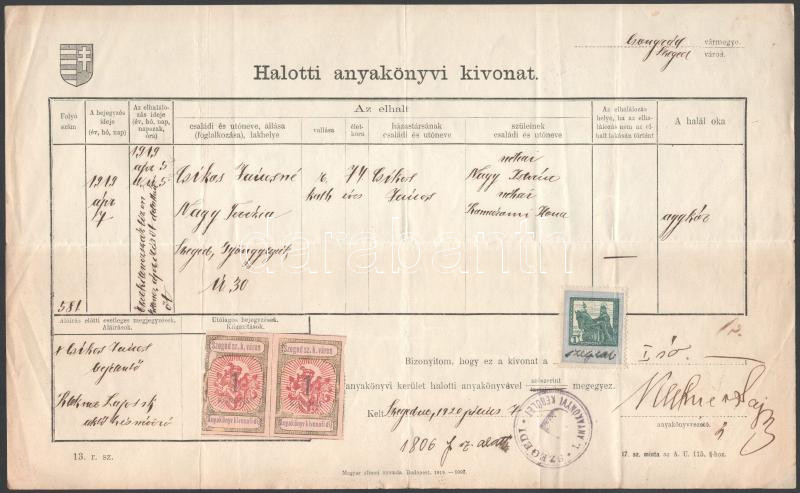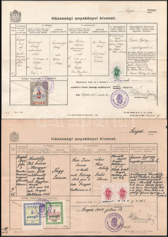 3 db anyakönyvi kivonat szegedi illetékbélyegekkel