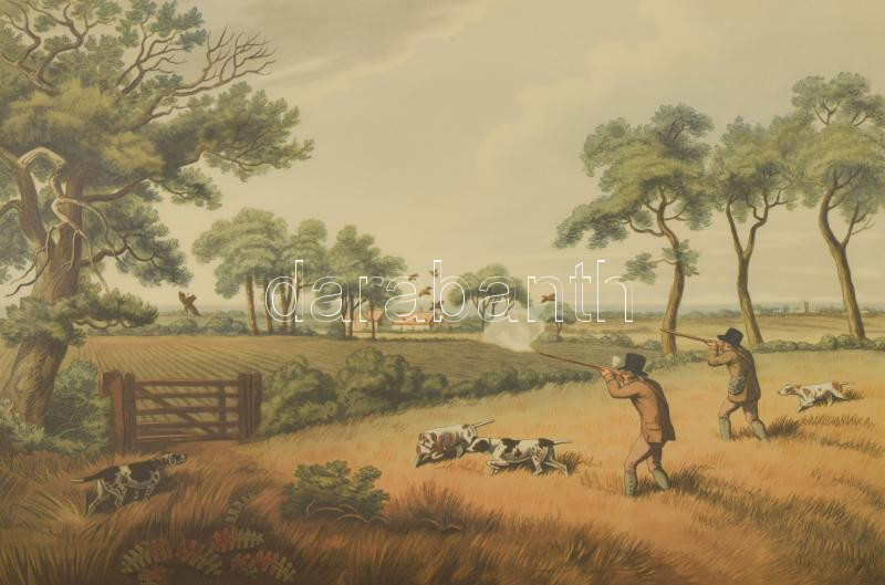 Vadász litográfia. Fogoly vadászat. Nagy méretű litográfia. Howit fest...