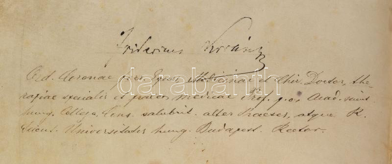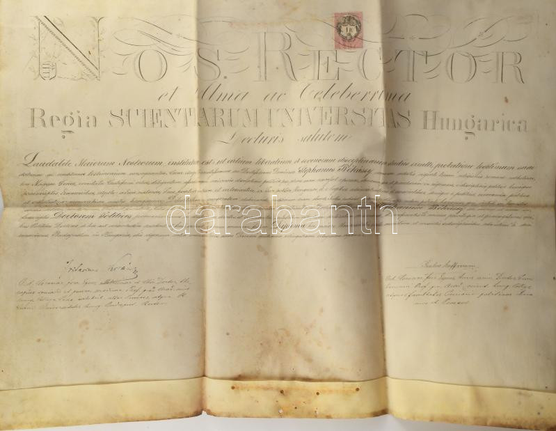 1887 Békássy István (1863-19321) Vas vármegye aljegyzője, majd főispánja államtudományi doktori oklevele ("doctorem politices"), a Budapesti Tudományegyetem rektora, Id. báró Korányi Frigyes (1828-1913) orvos, egyetemi tanár, egyetemi rektor (1886-1887), és Hoffmann Pál (1830-1907) jogász, dékán, egyetemi tanár aláírásaival, 1 Ft okmánybélyeggel, pergamen, foltos, hajtott, függőpecsét nélkül.