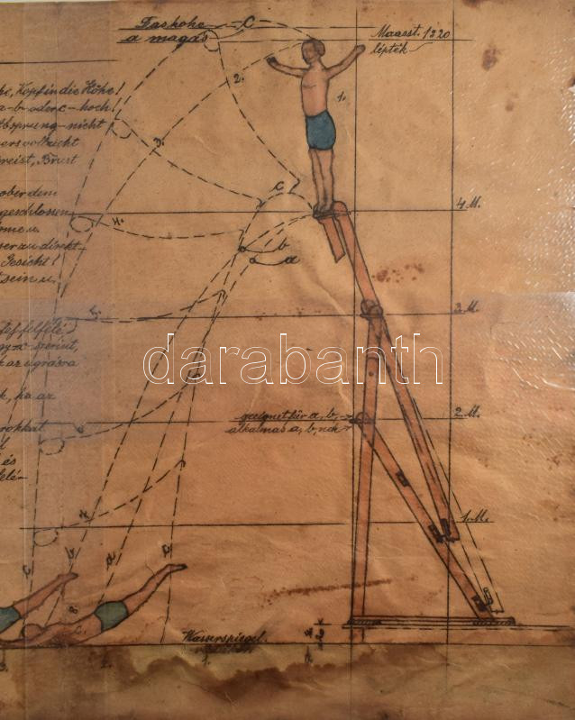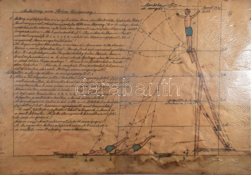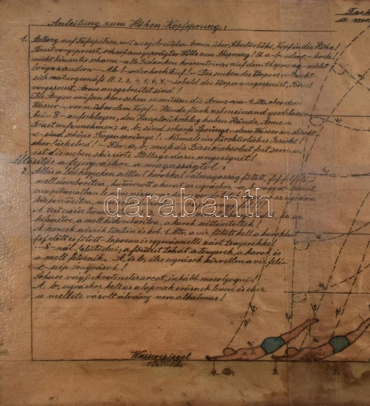 ca 1910 Bevezetés a toronyugrásba. Magyar és német nyelven írt és egyedi rajzos ív, magasról való fejesugrás technikájáról, 50x35 cm