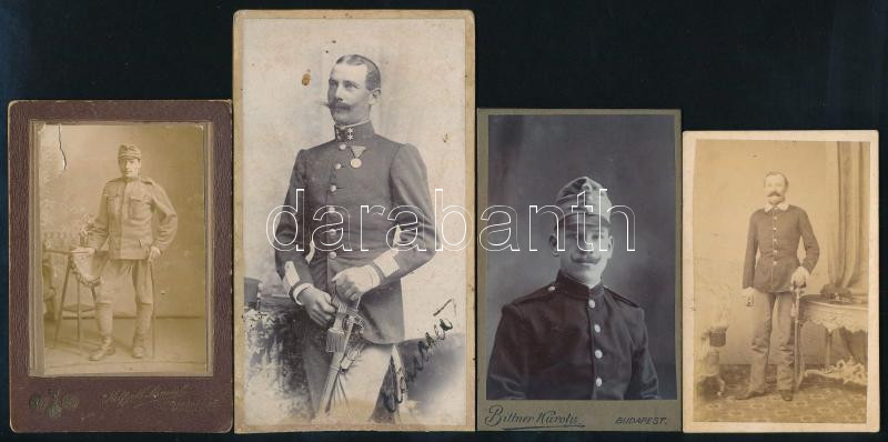 Description: cca 1870-1910 Katonaportrék, 4 db keményhátú fotó, különféle műtermekből (Divald Károly fia, Eperjes; G. Wünsch, Bécs; Helfgott Sámuel ill. Bittner Károly, Bp.), változó méretben és állapotban