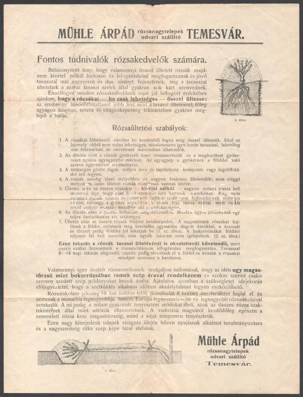 1913 Temesvár, Mühle Árpád rózsatelepek udvari szállítójának hírlevele a rózsaültetés szabályairól